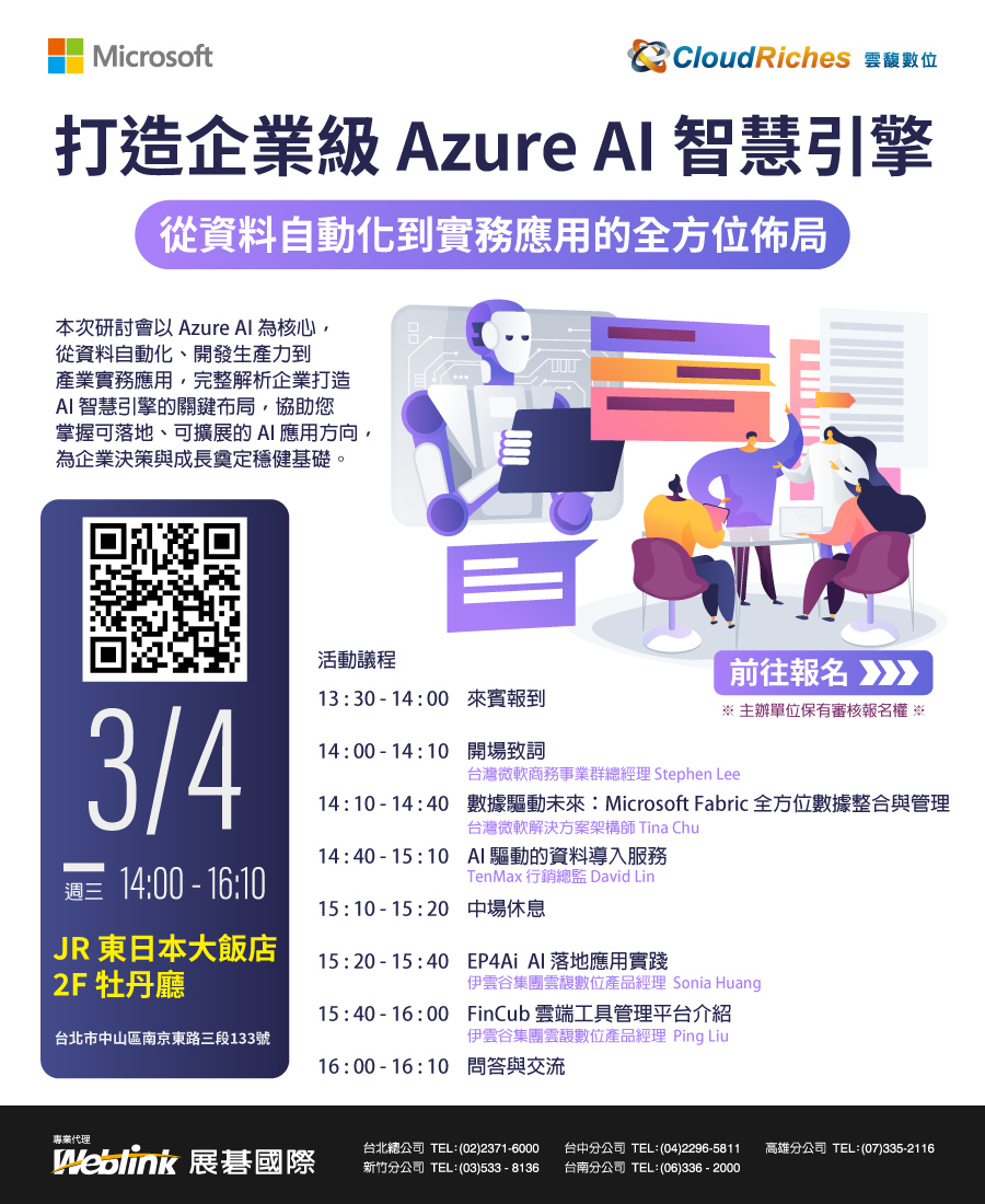 企業數位轉型所面臨的不僅是生產力突破的契機,更伴隨著如何有效管理海量數據的挑戰,以 Azure AI 為核心,深度解析如何從「資料自動化」出發,透過 Microsoft Fabric 實現全方位數據整合,並銜接至產業實務應用。我們誠摯邀請企業領導者與 IT 管理者,一同掌握可落地、可擴展的 AI 佈局方向。